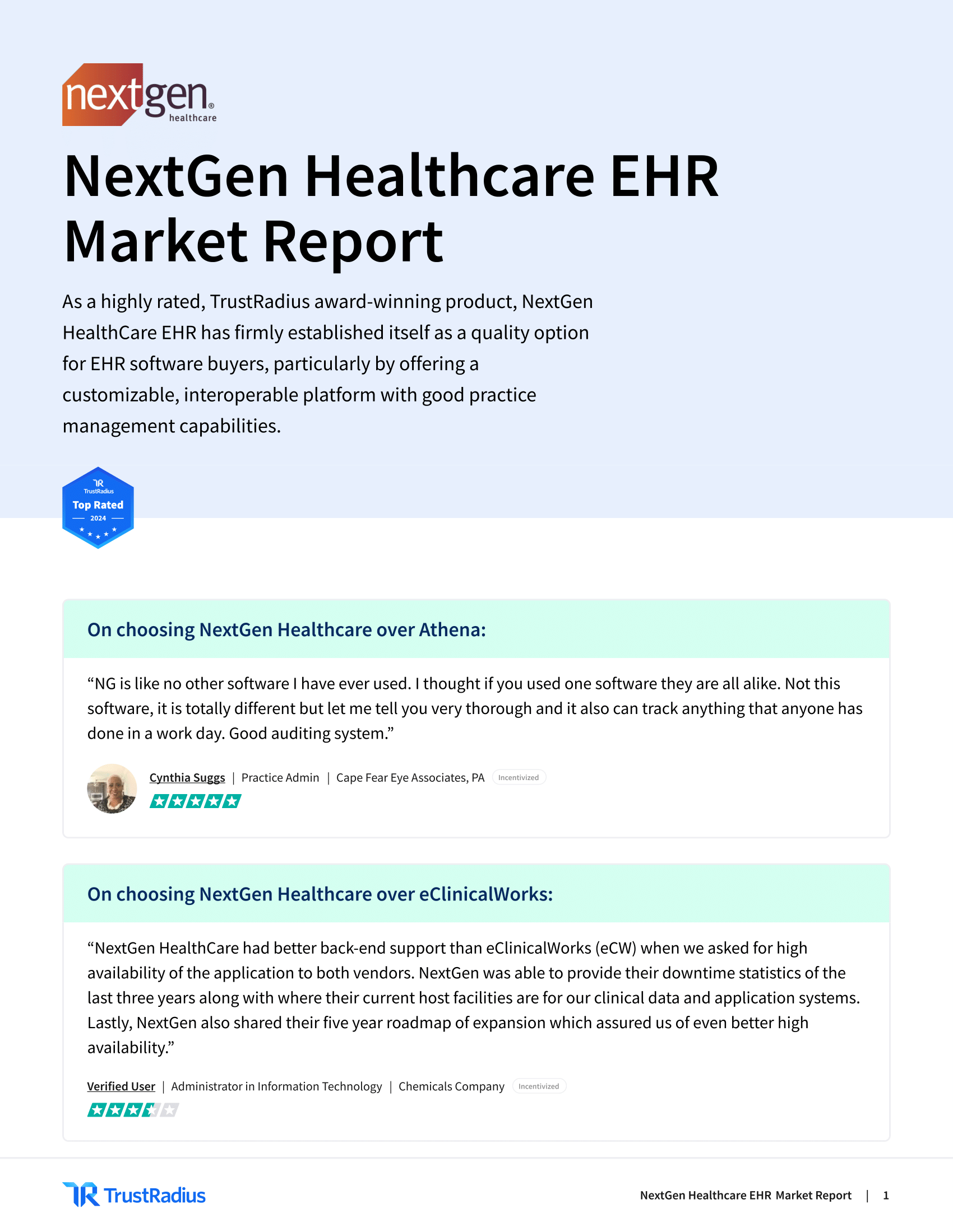 This report highlights NextGen Healthcare EHR as a highly rated and award-winning product, particularly praised for its customizability, interoperability, and strong practice management capabilities. It showcases user testimonials and data to illustrate the EHR’s effectiveness and user satisfaction.